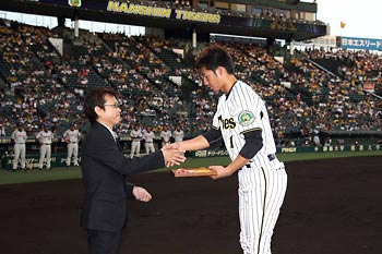 9月10日(金)対ヤクルト戦の試合前に、セ・リーグ8月度「日本生命月間MVP」打者賞を受賞した鳥谷敬選手への表彰式をおこないました。