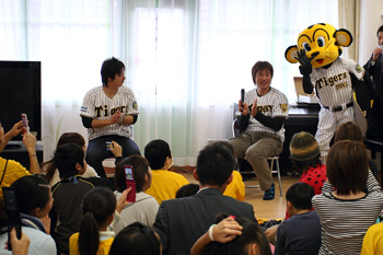 16日(木)、『Dream Linkプロジェクト』の一環として、関本賢太郎選手と西村憲選手が神戸大学医学部付属病院小児科病棟を訪れました。両選手達は、入院中の子供たちと『じゃんけん大会』や『質問コーナー』などで楽しい時間を過ごしました。両選手とも、甲子園球場になかなか応援に来られない子供たちに元気をあたえようと訪れたはずが、子供たちのたくさんの笑顔や喜ぶ姿を見て、逆にパワーをもらったようです。