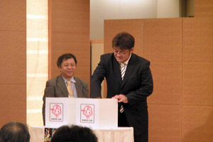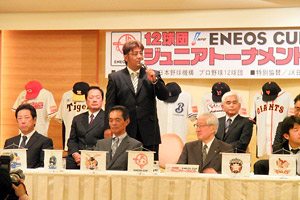 2日(金)、東京都内のホテルで『NPB12球団ジュニアトーナメントENEOSCUP2011』の監督記者会見と組合せ抽選会が行われ、亀山努監督が出席しました。