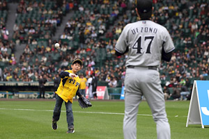 続いて、7月に実施した『DreamLink七夕スペシャル』の企画で募集したファンの皆様の『願い』の中から、『選手とキャッチボールがしたい』『グラウンドキーパーを体験したい』というファンの願いを実際にグラウンドで叶えていただきました。
