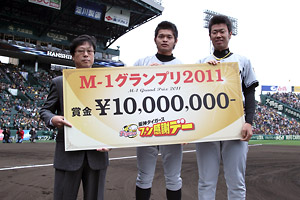 また、今季最も活躍した若手選手に贈られる「M-1」の獲得選手も発表。柴田選手と榎田投手が選ばれ、南球団社長より賞金1,000万円を授与されました。