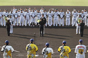 練習前には、宜野座村による歓迎セレモニーが行われ、和田監督の挨拶では「宜野座で1ヶ月腰を据えてキャンプに取り組みます。