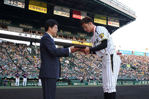 鳥谷敬選手には、セントラル野球連盟および、球団、スポンサーより賞品と記念品が授与されました。