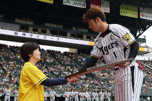 受賞した鳥谷敬選手には、球団およびスポンサー各社、また公式ファンクラブ会員を代表して兵庫県 伊藤 充子様より、 賞品と記念品が授与されました。