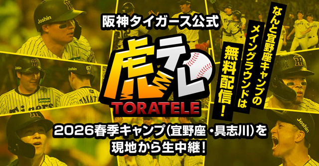 球団公式動画配信サービス「虎テレ」では、今年も「バイトするならエントリー宜野座スタジアム(宜野座村野球場)」で行われる春季キャンプ2026のメイングラウンドでの練習の模様を練習開始から終了まで無料でライブ配信します。また虎テレをご契約の皆様(有料)は、メイングラウンドに加えて、サブグラウンドやブルペン、室内練習場での練習風景、沖縄県うるま市の具志川球場で開催するファームキャンプの模様もご覧いただけます。