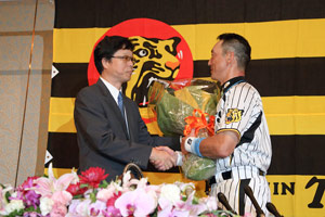「プロ野球選手として21年間の長きにわたり活躍し、タイガースでは2003年、2005年のリーグ優勝の原動力となり、これまで後輩の手本としてチームを引っ張ってきてくれた。どれだけチームが助けられてきたか。功績をあげればきりがない。1492試合連続フルイニング出場記録は想像を絶する努力の賜物である。近年は故障と闘いながら、ここまで本当に頑張ってくれたと思う。金本選手には心から「お疲れ様でした。」と申し上げたい。」