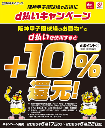 ドコモMAXデー当日を含む6/17(火)~6/22(日)は阪神甲子園球場内でd払いをご利用いただくと、dポイント(期間・用途限定)を10%還元するキャンペーンを実施します。