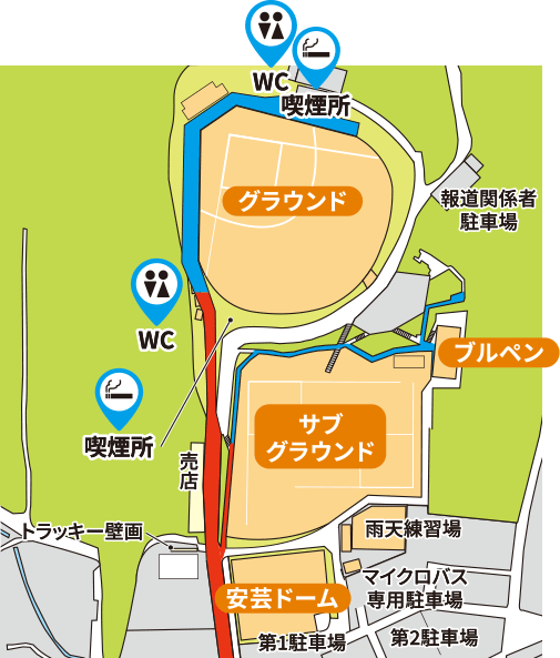 観覧可能エリアにつきましては、下記キャンプ地マップをご参照ください。なお、安芸ドームおよび雨天練習場ではご観覧いただけません。