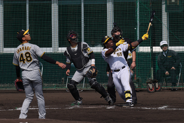 12日(月・振)、この日の紅白戦には、体調不良から復帰の梅野が実戦初出場。才木・秋山の先発で試合が始まる。初回白組は、1番佐藤輝が秋山から右越えに先頭打者アーチを放ち先制した。「しっかり高めの球を強く叩けたので良かった。練習でやってる方向性が間違ってないのかな、というのはこの実戦で感じられた」。 佐藤輝明内野手は、打撃フォーム改造の手応えを口にしている。