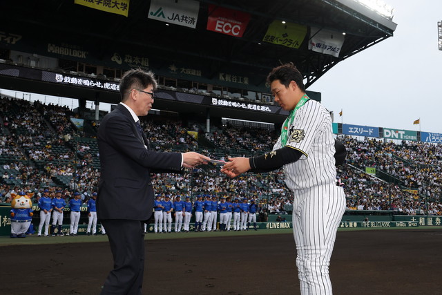 28日(水)、阪神甲子園球場での対横浜DeNAベイスターズ戦の試合前に、4月26日(土)の対読売ジャイアンツ戦で、「公式戦通算1000試合出場」を達成した大山悠輔選手の表彰式が行われました。