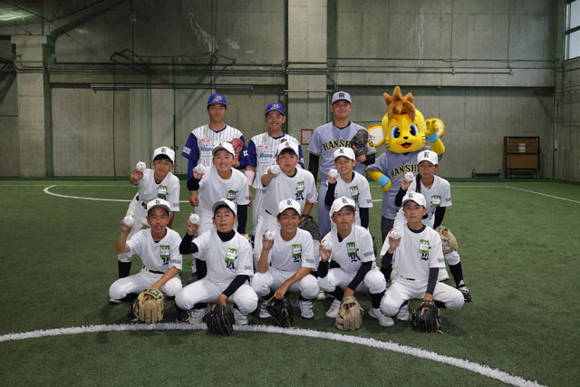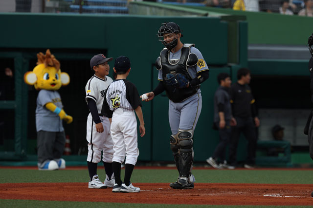 試合前には、グラウンドレベルでの練習見学会、少年少女野球チームとタイガース・富山GRNサンダーバーズの選手によるキャッチボールイベントや、記念撮影会を行い、試合終了後には、恒例となったファン交流イベントを実施。グラウンドに立った約60名のファンの皆さまと、ハイタッチイベントや、ヒーロー選手との記念撮影会を行いました。