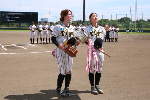 阪神TWの決勝の対戦相手は昨年のトーナメント大会、準決勝で敗れた前年の優勝チームの大体大。今大会でも侍ジャパン代表候補6選手を擁し、2回戦では、今春の女子高校野球選抜大会で優勝した神戸弘陵高を破り、決勝に駒を進めてきた。