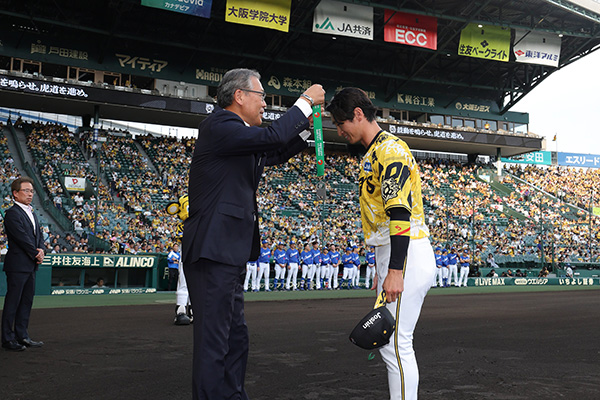 16日(水)、阪神甲子園球場での対中日ドラゴンズ戦の試合前に、6月7日(土)の対オリックス・バファローズ戦で「公式戦通算1000本安打」を達成した近本光司選手の表彰式が行われました。