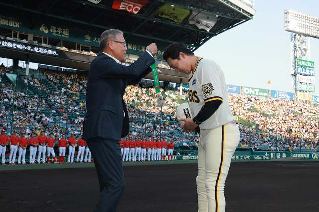 30日(水)、阪神甲子園球場での対広島東洋カープ戦の試合前に、7月21日(月・祝)の東京ドームでの対読売ジャイアンツ戦で「公式戦通算1000本安打」を達成した大山悠輔選手の表彰式が行われました。