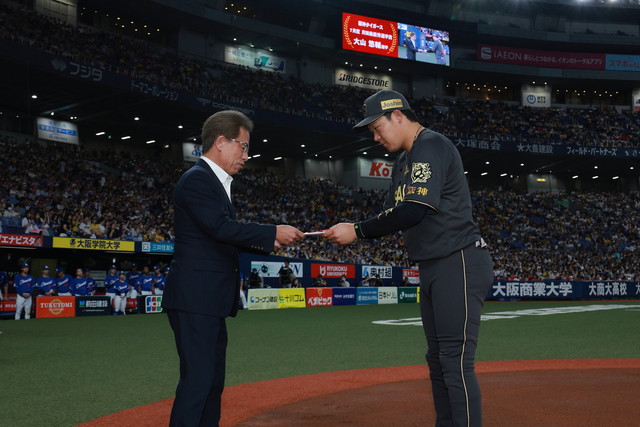球団選定7月度月間最優秀選手に大山悠輔選手が選ばれ、20日(水)、京セラドーム大阪での対中日ドラゴンズ戦の試合前に表彰式を行いました。