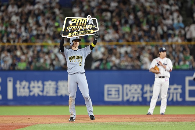 22日(月)、明治神宮野球場での対東京ヤクルトスワローズ戦において、近本光司選手が公式戦通算200盗塁を達成いたしました。