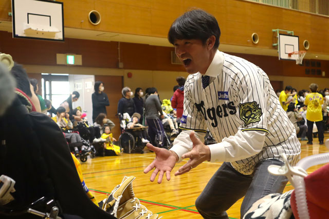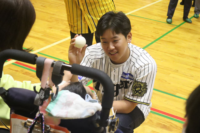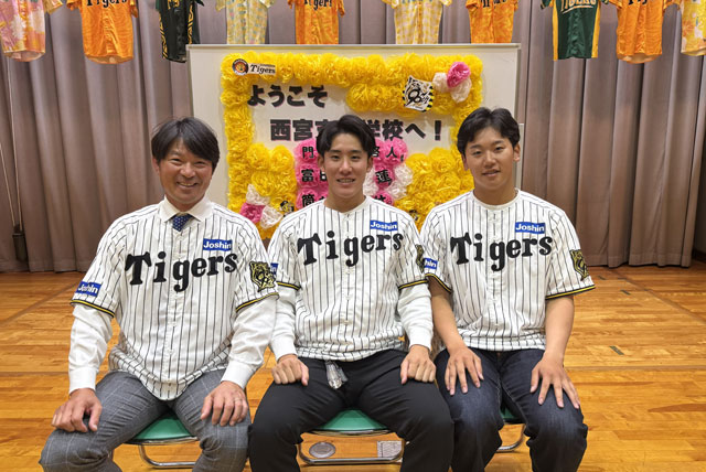6日(金)、富田蓮選手、門別啓人選手、筒井壮コーチが、西宮市立西宮支援学校を訪問しました。児童生徒の皆さんから歓迎を受けて登場した選手達は、質問コーナーやキャッチボールなどで児童生徒の皆さんとふれあいました。