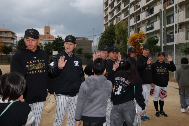 授業終了後には、生徒の皆さんから指導してくれた選手へお礼として「六甲おろし」の歌のプレゼントも!最後は記念撮影会、ハイタッチ会も行われ、グラウンドは皆さんの笑い声や笑顔で溢れていました。