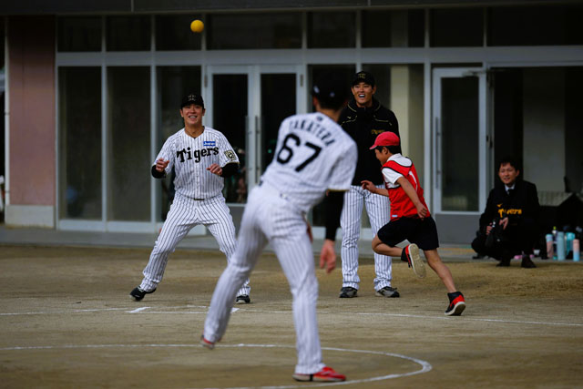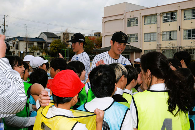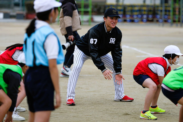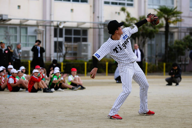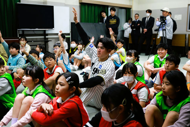 8日(月)、セントラル・リーグ公式戦のタイトルパートナーで、日本最大の発電会社である株式会社JERA(以下、JERA)の特別協賛による「JERAセ・リーグCHALLENGE次世代支援プロジェクト 阪神タイガース@尼崎市立竹谷小学校」が行われ、現役選手から豊田寛選手、髙寺望夢選手が、タイガースベースボールアカデミーから髙濱祐仁コーチ、望月惇志コーチが参加しました。