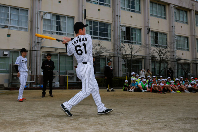 授業中、サプライズで豊田選手と髙寺選手に遠投とバッティングを披露してもらう機会を設けると、豊田選手・髙寺選手ともにホームランを放ち、生徒たちはその飛距離に「スゴーい」と目を輝かせて大いに盛り上がりました。