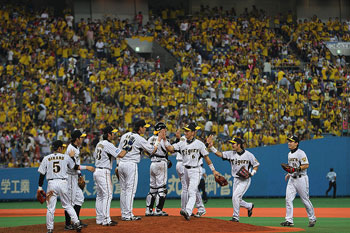 23日、対広島17回戦(京セラD)で開催いたしました「イエロー&イエロー大作戦」へのたくさんのご来場ありがとうございました。来場者プレゼントとしてお配りしたイエローTシャツをご着用いただき、32、314名の観衆で埋まったスタンドのほとんどがタイガースカラーで染まりました。「ともに戦う。ともに喜ぶ。」の言葉通り一体となった熱い応援により、試合も見事勝利を収めることができました。