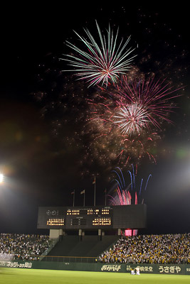 昨日6日(火)、倉敷マスカットスタジアムでおこなわれた対ヤクルト戦。この日は、阪神タイガース球団創立75周年と倉敷マスカットスタジアム開場15周年を記念し5回裏終了後に、約450発の花火が打ち上げられ倉敷の夜空を彩りました。