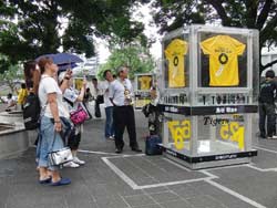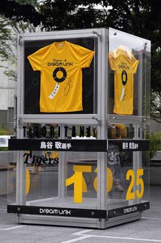 (1)ミズノスクエアでは、選手直筆の願いが書かれたTシャツの展示。