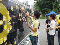 (2)Tシャツ展示の横では、皆さんの願いをステッカーに書き込み