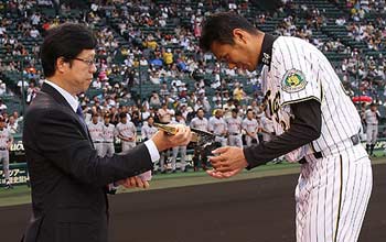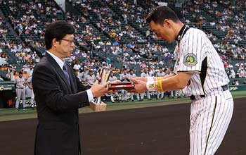 7月13日(火)対読売ジャイアンツ戦の試合前に、450本塁打記録を達成した金本知憲選手とセ・リーグ6月度「日本生命月間MVP」投手賞を受賞した久保康友投手への表彰式をおこないました。