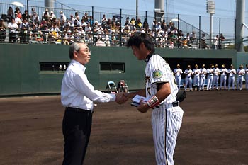 9月10日(金)、鳴尾浜球場でのソフトバンク戦の試合前に、球団選定8月度ファーム月間MVPに選ばれた野原将志選手の表彰式がおこなわれました。受賞した野原将志選手には、球団およびスポンサー各社より賞品と記念品が授与されました。