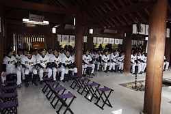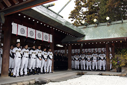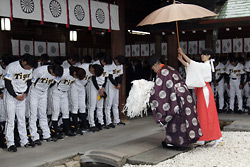1日(火)、真弓監督以下、選手・スタッフ・職員が西宮市内の廣田神社を参拝しました。小雨の降るあいにくの天気にも関わらず駆けつけてくださったファンの方々に見守られる中坂井オーナー、南社長とともに今期の必勝を祈念しました。