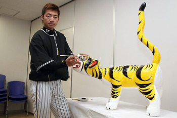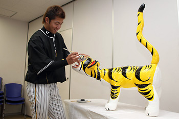 10日(木)試合前、信貴山・朝護孫子寺の張り子の虎に優勝を祈願し目を入れる『目入れ式』を行いました。昨年に引き続き、鳥谷選手会長が優勝への願いを込めて、筆で慎重に目を入れました。