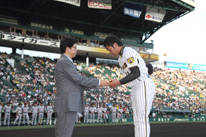 球団選定6月度月間MVPに岩田稔投手が選ばれ、13日(水)、対巨人戦の試合前に表彰式を行いました。