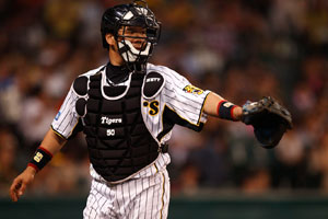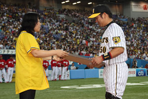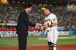 16日(火)、京セラドーム大阪で開催された対広島戦の試合前に、球団選定7月度月間MVPに選ばれた藤井彰人選手の表彰式を行いました。受賞した藤井彰人選手には、球団およびスポンサー各社、公式ファンクラブ会員の藤原朋子様より賞品と記念品が授与されました。