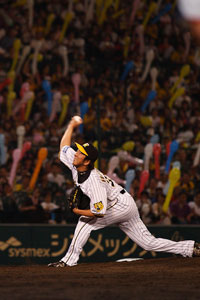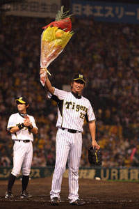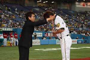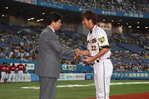 8日(木)、京セラドーム大阪で開催された対広島戦の試合前、8月28日(日)に阪神甲子園球場で行われた対東京ヤクルト戦で、公式戦通算500試合登板の記録を達成した藤川球児投手の表彰式を行いました。藤川球児投手には、セ・リーグ、球団、およびスポンサー各社より賞品と記念品が授与されました。