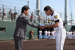 29日(木)、阪神鳴尾浜球場での中日ドラゴンズとの練習試合前に表彰式を行い、倉垣営業部部長より賞品と記念品が授与されました。