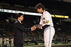 18日(火)、阪神甲子園球場での対東京ヤクルト戦の試合前、9月28日(水)の対東京ヤクルト戦(神宮球場)で公式戦通算250号本塁打記録を達成した、新井貴浩選手の表彰式を行いました。