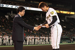 受賞した鳥谷敬選手には、球団およびスポンサー各社、公式ファンクラブ会員の西内和生様より賞品と記念品が授与されました。