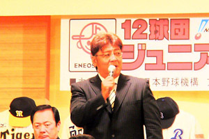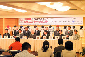 2日(金)、東京都内のホテルで『NPB12球団ジュニアトーナメントENEOSCUP2011』の監督記者会見と組合せ抽選会が行われ、亀山努監督が出席しました。