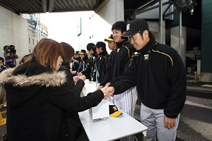 球場内コンコースでは、選手らが募金箱を持って各所に登場する『チャリティーふれあい握手会』を行いました。