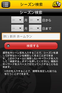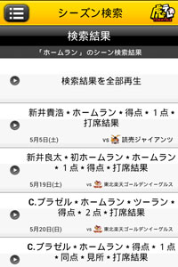 この「シーズン検索」機能は、これまでのシーン検索(1試合内の検索機能)を拡張し、シーズンを通して複数の試合の中から特定のシーンを検索して再生することが出来ます。「サヨナラゲーム」の瞬間だけや、「ホームラン」だけのシーンなど、自分が見たいシーンだけを検索して、連続再生することができます。白熱した「奪三振ショー」を見るもよし。興奮した「得点シーン」だけを見るもよし。