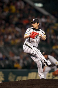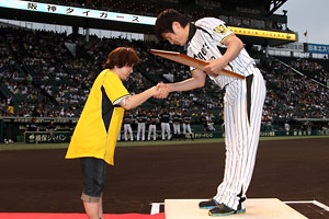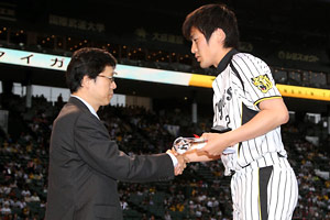 11日(月)、福岡ソフトバンクホークス戦の試合前に表彰式を行い、受賞した筒井和也投手には、球団およびスポンサー各社、また公式ファンクラブ会員を代表して奈良県生駒郡 坂本 美保様より賞品と記念品が授与されました。