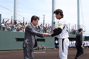 受賞した玉置隆投手には、粟井一夫常務取締役より賞品と記念品が授与されました。