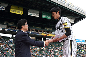 球団選定3・4月度月間MVPに藤浪晋太郎投手が選ばれ、15日(水)、対オリックス・バファローズ戦の試合前に表彰式を行いました。