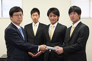 15日(水)、球団事務所にて今年成人式を迎えた松田遼馬選手、歳内宏明選手、西田直斗選手へ球団より祝福と訓示および記念品の贈呈を行いました。