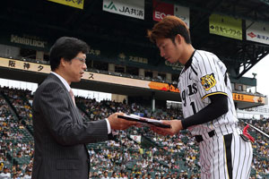 受賞した鳥谷敬選手には、球団およびスポンサー各社、また公式ファンクラブ会員を代表して兵庫県 伊藤 充子様より、 賞品と記念品が授与されました。