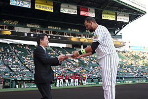 球団選定3.4月度月間最優秀選手にマウロ・ゴメス選手が選ばれ、27日(水)、東北楽天ゴールデンイーグルス戦の試合前に表彰式を行いました。