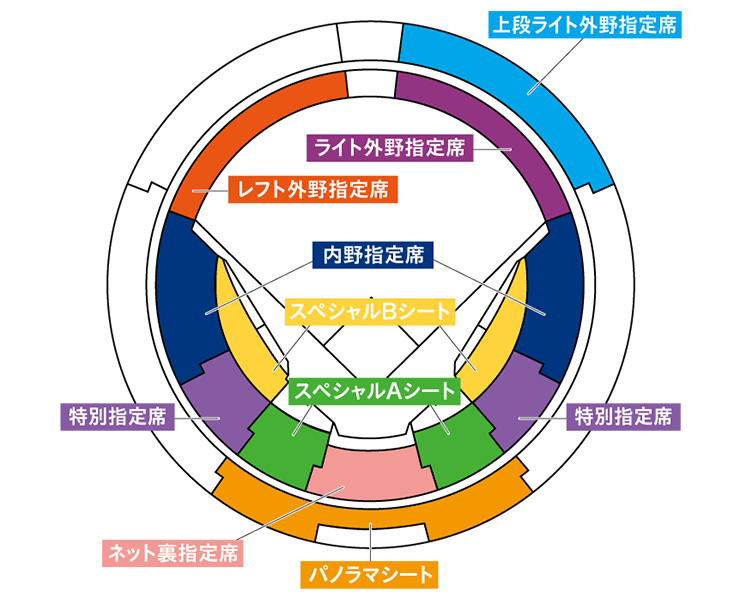 - ※シーズンチケットでは、ロイヤルシート、フィールドシートA、フィールドシートB、ダグアウトビューシート、上段内野指定席、上段レフト外野指定席、上段レフトビジター専用応援席の発売はございません。