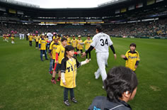 KIDS会員60名を事前募集。グラウンドへ入場する選手たちが子供たちとハイタッチをしてふれあいました。