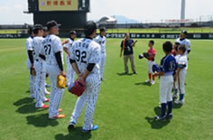 中日と行われたウエスタン・リーグ公式戦後に地元の子供たち約110名を対象に、掛布ファーム監督、コーチ、選手全員による野球教室を行いました。